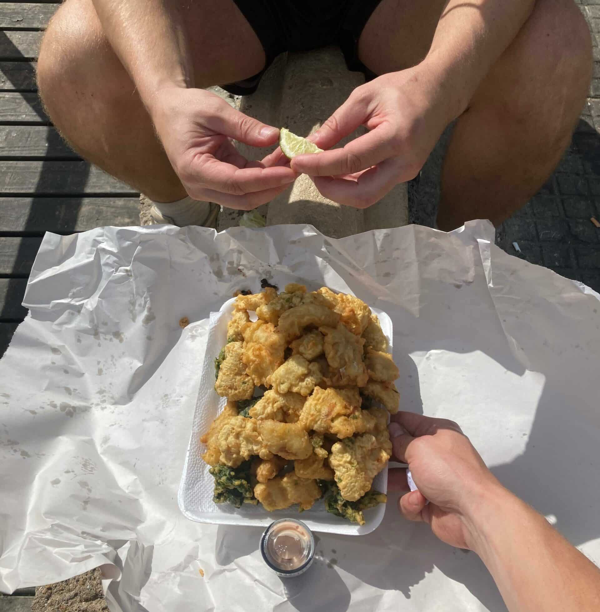 Ausstieg, ausladen, alles reibungslos. Halten kurz beim pittoresken Grand Hotel von Piriápolis. An den Außenflügeln bröckelt die Fassade ab. Im Herzstück fristet ein Casino sein Dasein. Was soll uns das sagen? Bei uns bröckelt noch gar nichts, wir müssen wohl los. Weit kommen wir nicht: Hinter der Stadt reihen sich Buden mit fangfrischen Fisch aneinander. Bei frittierten Camarones & Seetang schlagen wir zu. Dann noch einen Mate am Playa genießen – todo tranqui.