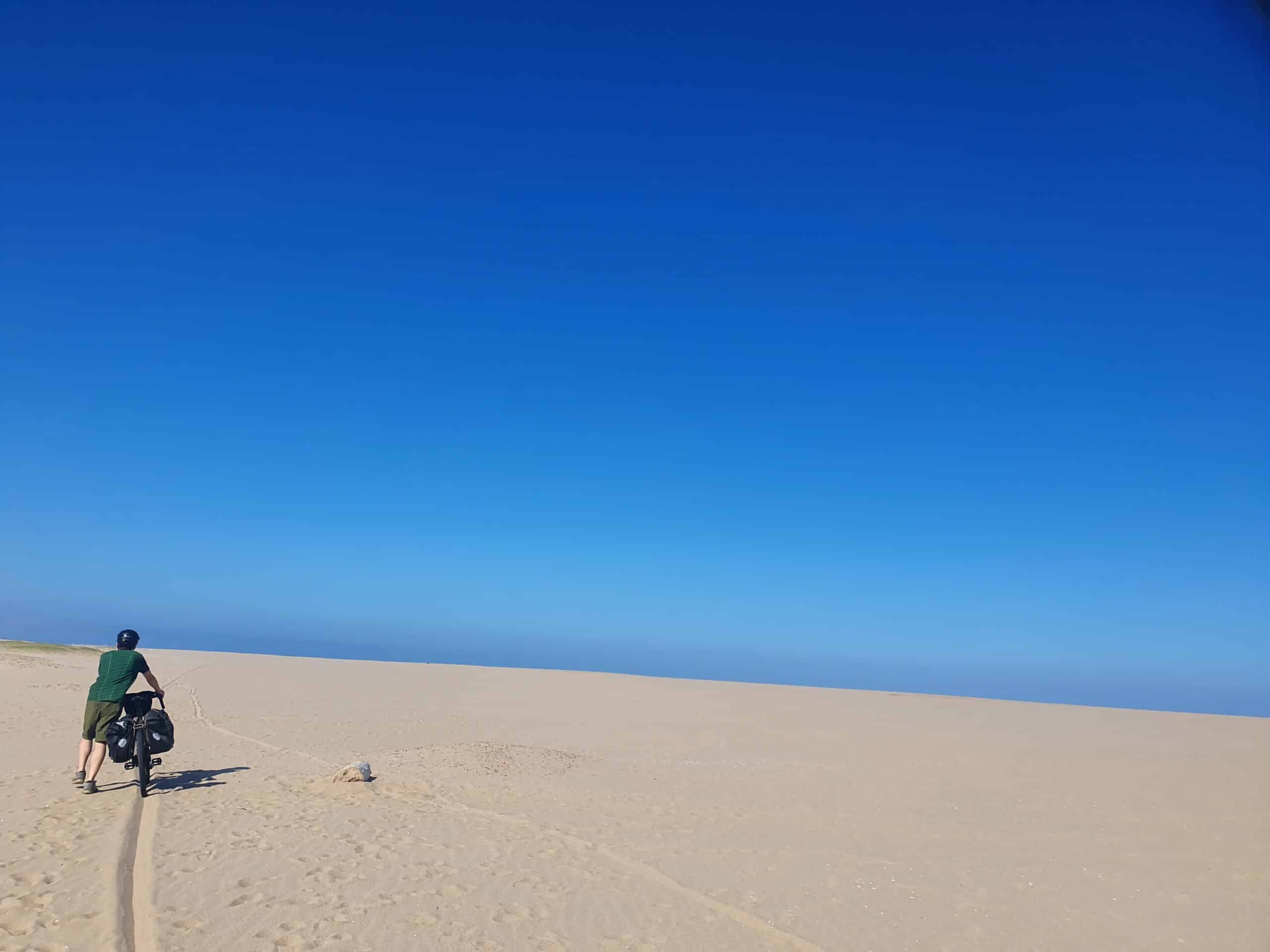 Plötzlich, als wir weiterradeln, erscheint ein Schild: Wir fahren auf einem Fahrradweg! Das geht dann sogar noch mehrere Kilometer weiter, bis wir bei San Antonio wieder in den Dünen campen.